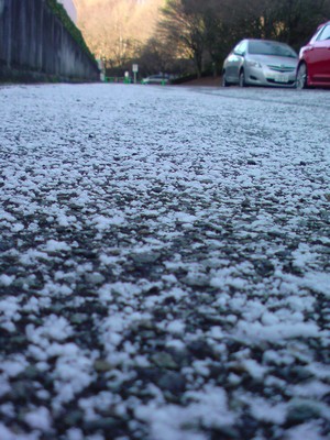 凍結防止剤?と、思ったのだが良く見ると雪だった。夜中に少しだけ降ったのが朝まで溶けなかったようだ。